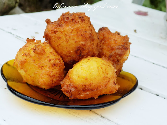 Dużą ilość oleju dobrze rozgrzać. Nabierać ciasto małą łyżeczką i kłaść je na oleju, smażyć z każdej strony, od razu po usmażeniu posypać cukrem pudrem.